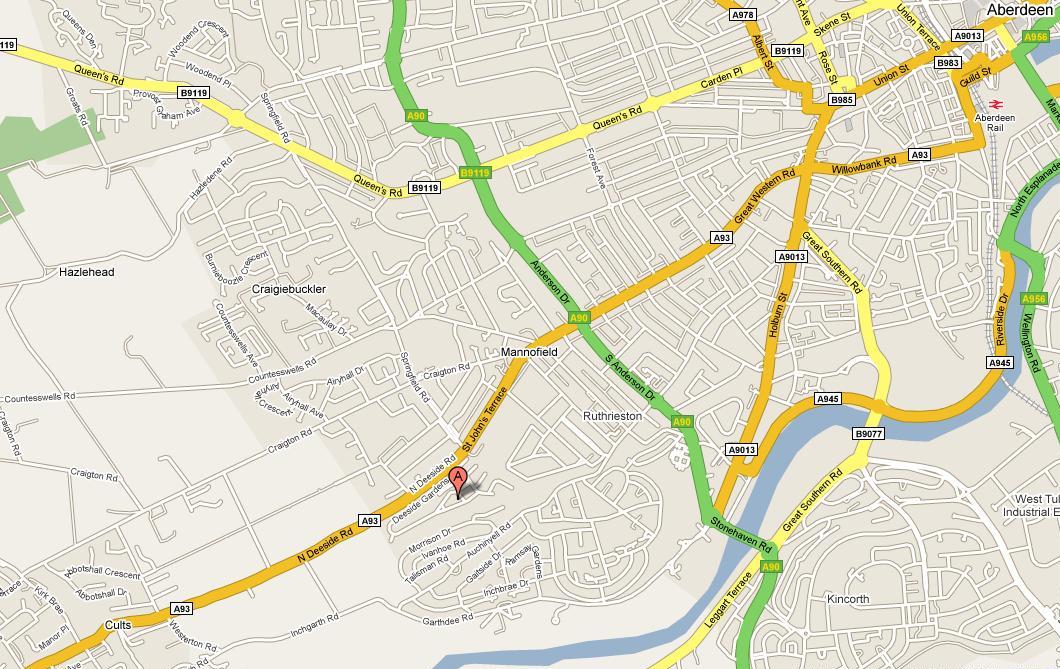 The church is located at the corner of Deeside Drive and Deeside Gardens, off the North Deeside Road (A93), in the west end of the city of Aberdeen...